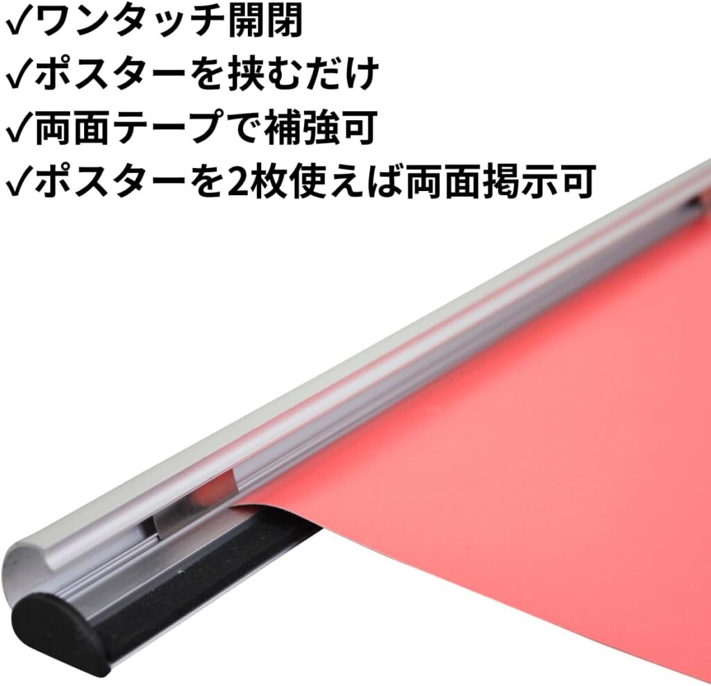 下画像のようにワンタッチで開閉でき、ポスターなどの上下を挟むだけでセットできます。