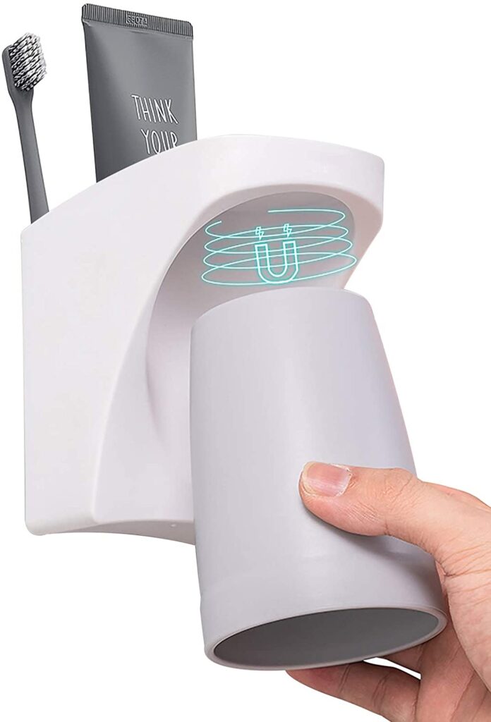 マグネット式の「歯磨きコップスタンド」で、浮かせて収納でき、収納場所を取らず、掃除も簡単◎。