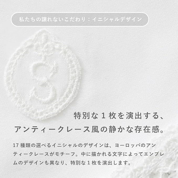 上でもご紹介した「hugge handkerchief(ハグ ハンカチーフ) イニシャル ノンレース ブライダルハンカチ」と同じ〝hugge handkerchief(ハグ ハンカチーフ)〟から展開されています。