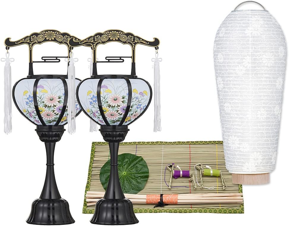 新盆用の白提灯・ミニ霊前灯(一対)・まこもがコンパクトにまとめられているので、限られたスペースでも華やかな新盆飾りを設置することができます。