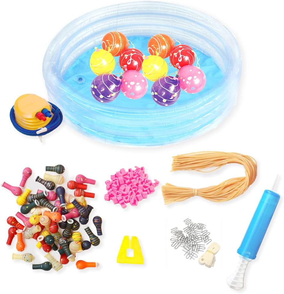カラフルな水風船100個、糸ゴム100本、しばらずパッチンクリップ100個、スタンド1個がセットになっています。