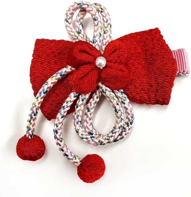 リボンにちりめんの花があしらわれたかわいいデザインで、中央に付けられた白いパール調のビーズがアクセントになっています。