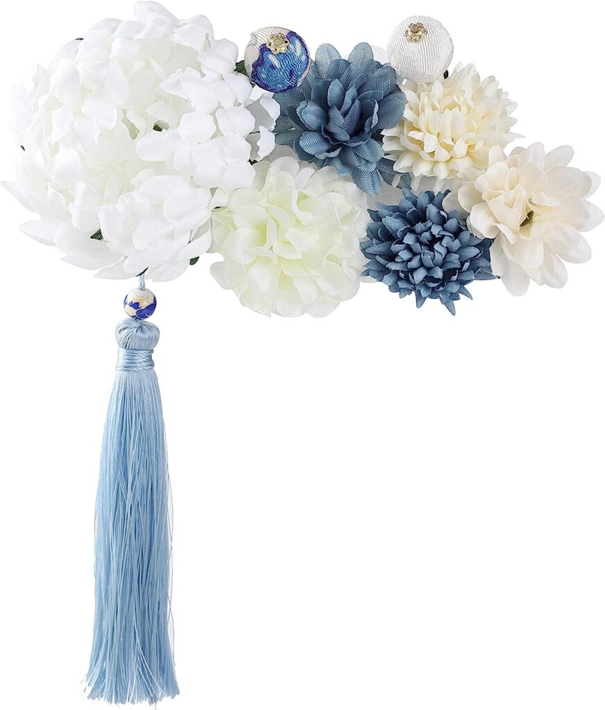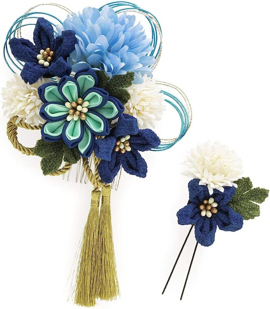 下画像のように白やブルーのコサージュ、タッセルなど、9本の髪飾りがセットになっています。