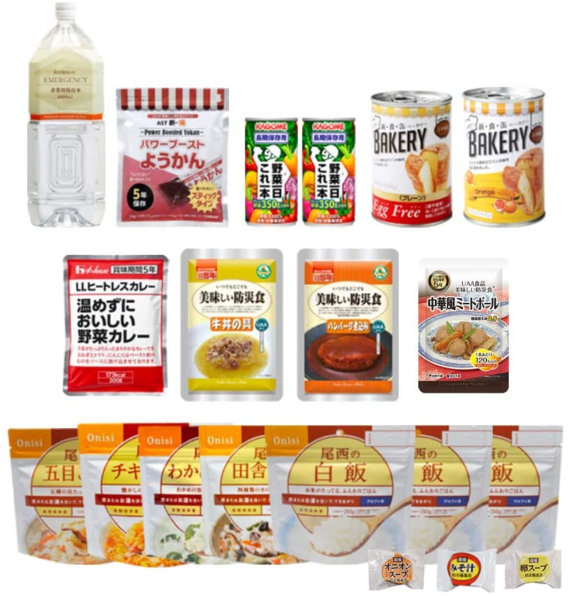 5年保存の水やお菓子の羊羹(ようかん)まで入ったぜいたくさが特長。