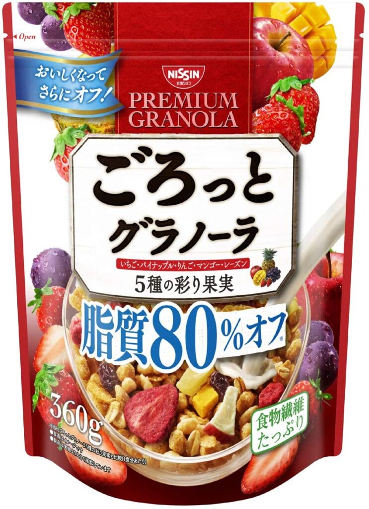 他社で脂質カットのものを買ったら 単にグラノーラを減らしてコーンフレーク多くを入れただけの残念なものがありありましたが こちらはちゃんとしっかり グラノーラ & フルーツ入って満足の味