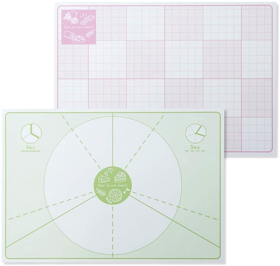 1cmのマス目がついた〝ピンク〟と、ホールケーキやピザを3等分or5等分にできる補助ラインがついた〝グリーン〟の2種のセット。