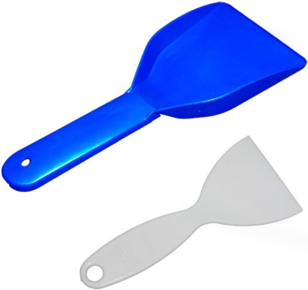 白い方で霜をガリガリ引っ掻いて、青い方でスコップのように霜を取り出します。