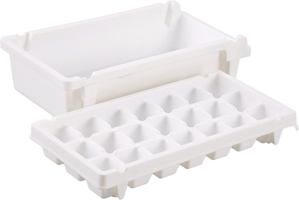 下画像のように、製氷トレーと受け皿は2段に重なるつくりなので、収納スペースを節約できます。