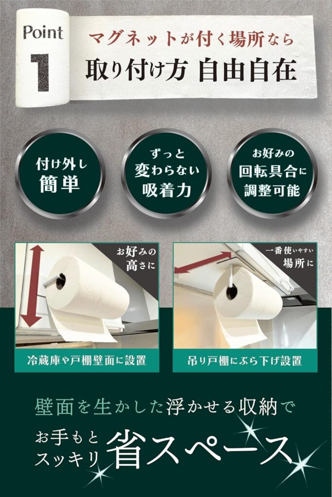 大判サイズに適応したものや、磁力が強いマグネット式のもの、置き型のものなど、さまざまな「片手で切れるキッチンペーパーホルダー」が展開されています。