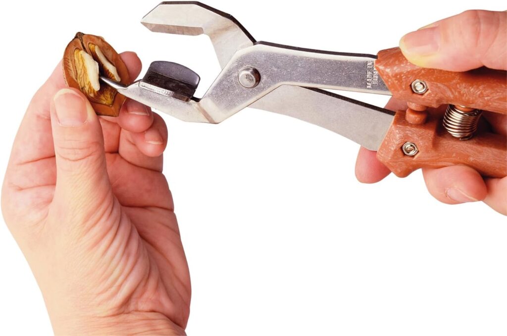 こちらも使い方が簡単で、先端にくるみを挟んで、持ち手を握って割ります。