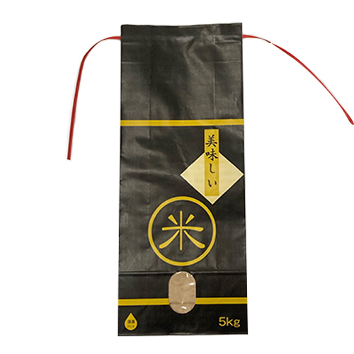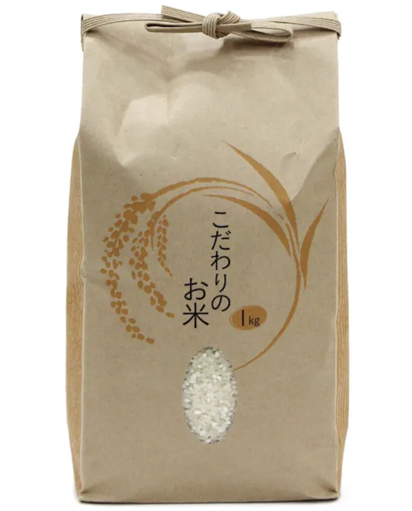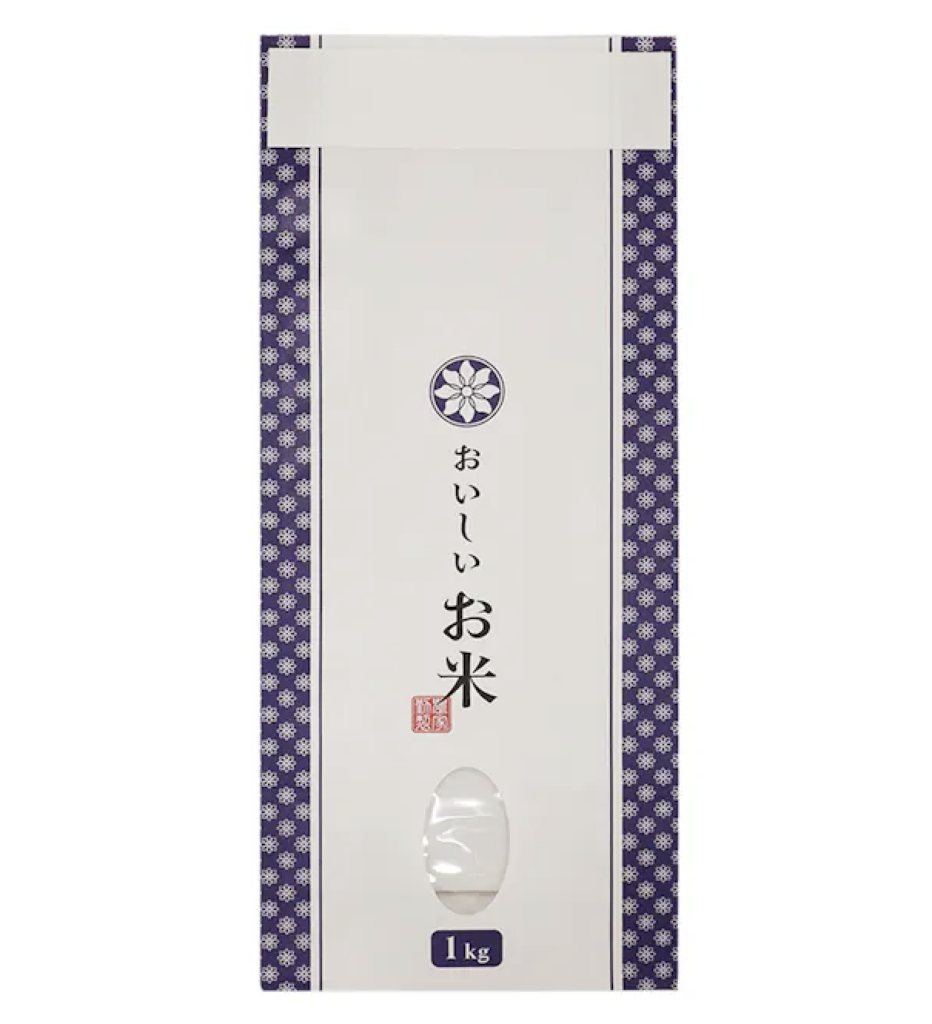 無地のクラフト紙で、中の米が見える透明窓が備わっています。
