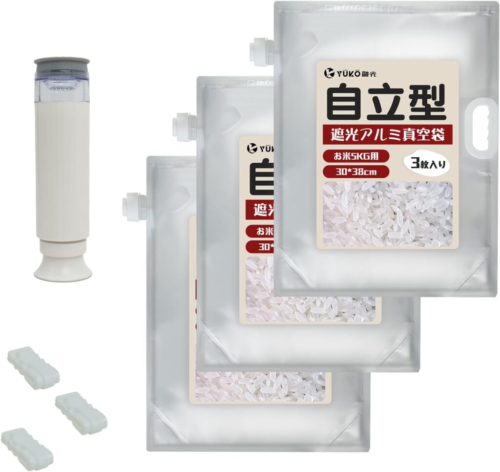 アルミ製で光や湿気を遮断できるものや、空気弁付きで真空状態を作りやすいもの、紐の結び方をアレンジできるものなど、さまざまな「米袋」が展開されています。