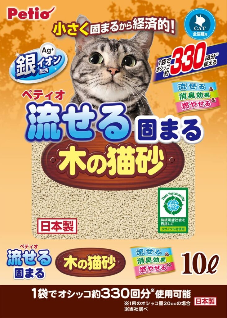 木製で消臭効果が高く、なにより口コミ評価がとても高いので、実用性の高い「トイレに流せる猫砂」をさがしている方で、とくべつこだわりのない方はこちらを選んでまず失敗はありません。