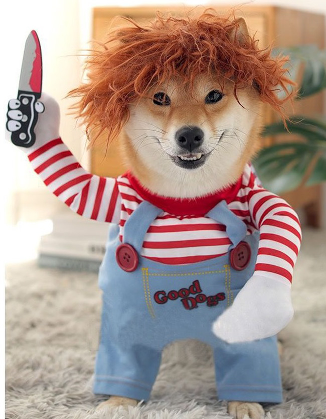 続いては、チャッキーになりきることができる、柴犬向けの「コスプレ衣装」。